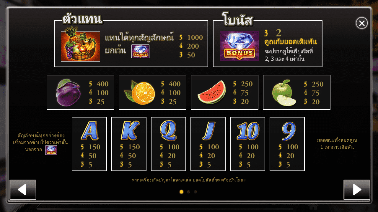 Royal Slot ผลไม้นำโชค เกมสล็อตออนไลน์ผลไม้นำโชคที่จะพาให้คุณได้เดิมพันคุ้นเคย ซึ่งการออกแบบที่เสมือนตู้สล็อตจริงๆ รูปแบบเดิมที่เสี่ยงดวงที่ง่ายมากขึ้น เพื่อให้นักเดิมพันได้เสี่ยงดวงไปกับเกมการพนันออนไลน์โด่งดังที่สุดในคาสิโนชื่อดัง เชื่อว่าใครที่เคยเสี่ยงดวงที่บ่อนคาสิโนน่าจะรู้จักเกมนี้ได้เป็นอย่างกี ด้วยภาพกราฟิกที่มีการออกแบบมีคุณภาพ โดยนักออกแบบเกมสล็อตออนไลน์ที่พัฒนามาพร้อมตอบโจทย์นักพนันโดยเฉพาะ พร้อมจะพาคุณเข้าสูงดินแดน จีคลับ แหล่งเกมการพนันในรูปแบบออนไลน์ที่พาคุณเสี่ยงดวงแบบเรียลไทม์ รับเละกับเงินรางวัลเมื่อคุณ ฝาก-ถอน-โอน แบบ 100% การบริการดีเยี่ยมพรีเมี่ยมโดยที่คุณไม่ต้องเดินทางไกลไปถึงบ่อน ก็สามารถเดิมพันได้ตลอดที่ Royal Slot Lucky Fruits