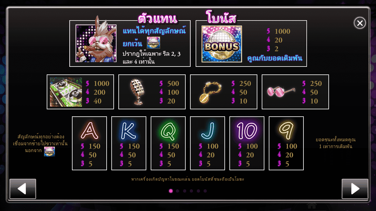 ตัวเกมมาพร้อมกาตูนสุดน่ารักกับ DJ กระต่ายสุดจ๊าบ ที่จะพาคุณดื่มด่ำไปกับรสชาติของการสร้างรายได้ นอกจากนี้เป็นตัวกาตูนแสนสนุกที่จะมาพร้อมเสียงเพลงสุดมันส์ ให้คุณได้เล่นสนุกไม่มีเบื่อ โดยตัวเกมเป็น สล็อต 5 รีล และ 3 แถว จ่ายเงินสูงสุด 25 เพลย์ไลน์ สามารถวางเงินเดิมพันได้ตามต้องการ นอกจากนี้ยังลุ้นรับฟรีสปินง่ายๆ แจ็คพอตแตกเร็วไม่ต้องรอนานเหมือนเว็บไซต์อื่นๆ